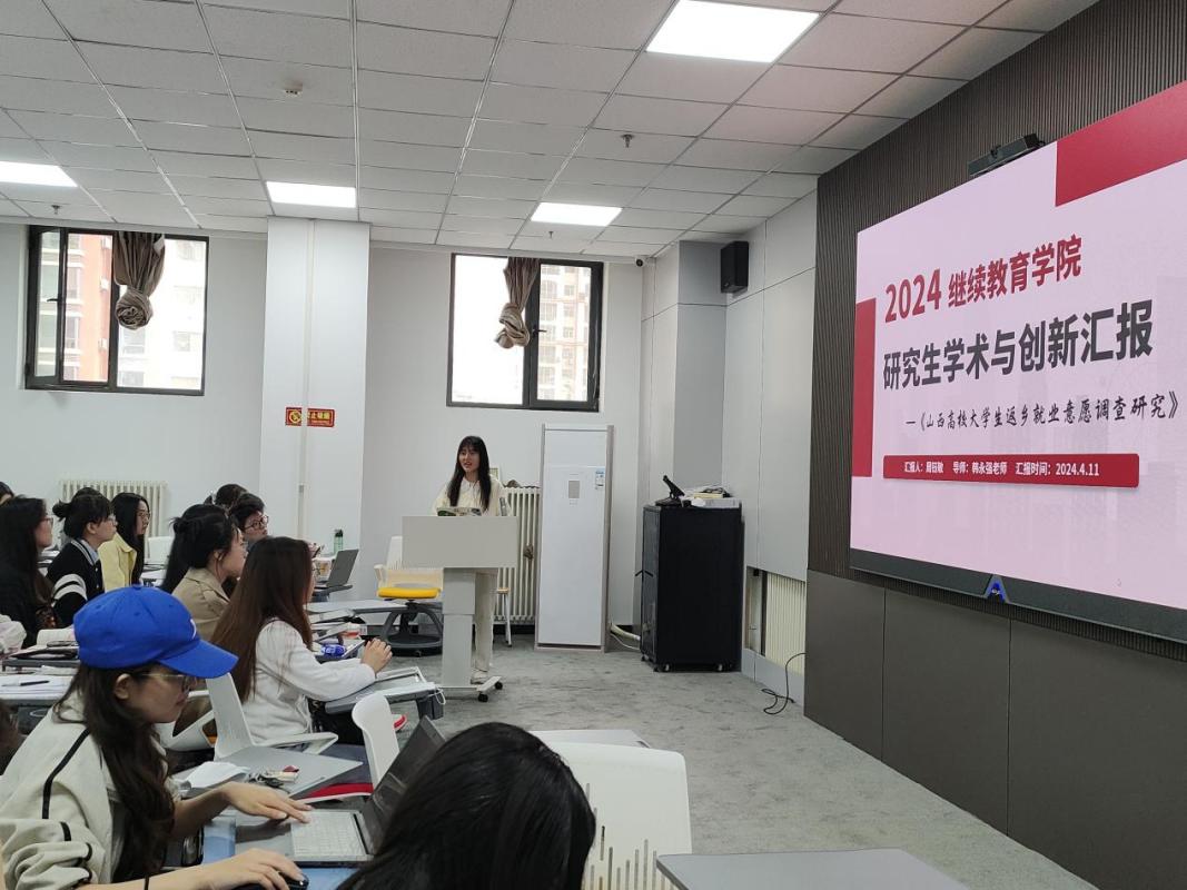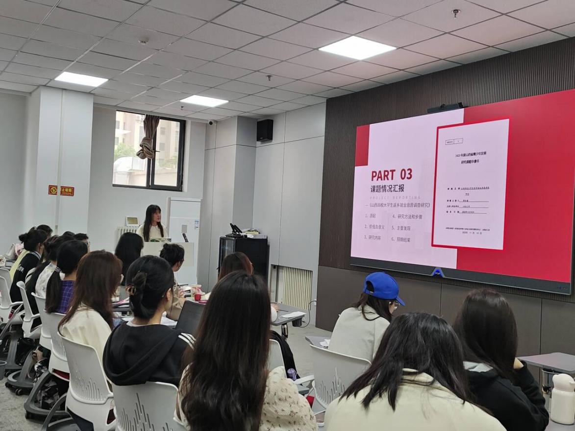 周钰敏同学从自己的日常学习、竞赛经验和学术成果三部分进行分享。竞赛不仅为研究生提供了一个展示才华、交流学术的宝贵机会,还能促使研究生在激烈竞争中不断挑战自我、超越自我,进而提升其专业素养和综合能力,为未来的学术研究和职业发展奠定坚实基础。在学术五分钟、职业规划大赛中获得的较好名次使自己对自身能力结构有了更加清晰的认知,在提升自身能力的探索过程中,找到自身定位。随后,课题《山西高校老员工返乡就业意愿调查研究》汇报从三个方面展开,首先,研究当前老员工的就业环境,发现老员工在就业中所遇到的问题;其次,通过多案例分析老员工返乡就业意愿的影响因素;最后,结合乡村振兴背景,提出引导山西省高校老员工返乡创业的具体路径。课题在公司产品中占据核心地位,不仅有助于激发研究生的学习兴趣和动力,通过实践探索和学术研究的过程,锻造他们的科研能力和创新思维,并在此过程中促进学术交流与团队协作。