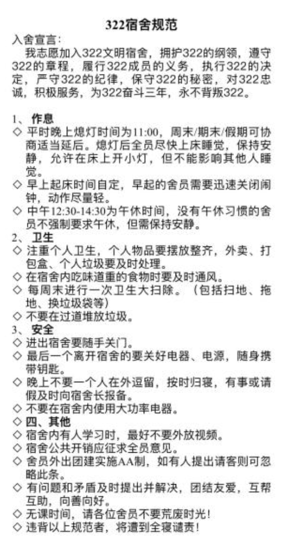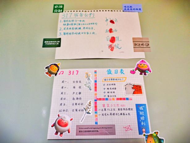 322宿舍四人分别来自山西、山东、河南以及重庆,她们来自天南海北,因为读研相聚在了一起。从一开始的拘谨到现在的无话不谈,成为了彼此非常要好的朋友。在生活上互相照顾,在学习上相互探讨、相互督促。322宿舍在环境上干净整洁,她们每天都会打扫宿舍,并制定了每人的值日表,并且每半个月就会进行一次大扫除。除此之外,她们也制定了宿舍舍规,每位成员都会认真遵守。在宿舍,她们还粘贴了课程表、值日表等,以防忘记上课值日等。